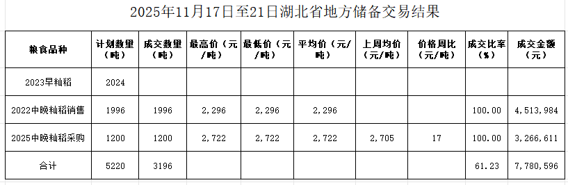本周湖北地储成交各类粮油3196吨。其中销售:2022年中晚籼稻1996吨,成交率100%,成交均价2296元/吨。采购:2025年中晚籼稻1200吨,成交率100%,成交均价2722元/吨,环比上涨17元/吨。