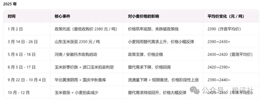 1 月开盘价与政策底基本持平,河南、山东等主产区托市收购启动后,价格始终未跌破 2380 元 / 吨的红线。替代作物成波动核心变量——2025 年小麦价格的每一次起伏,都与玉米价格高度联动: